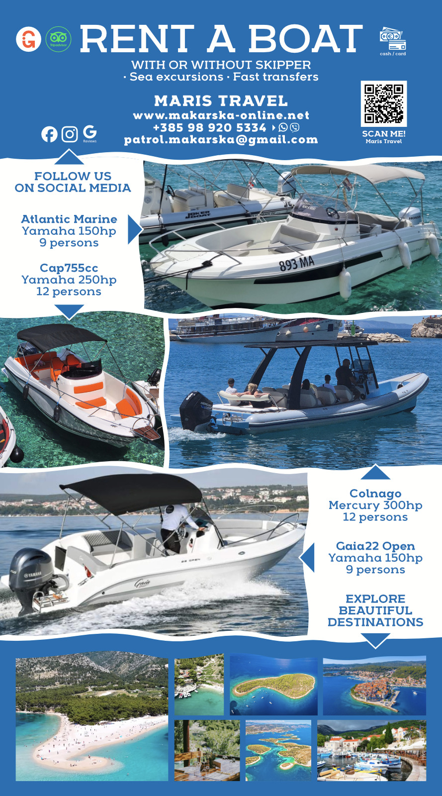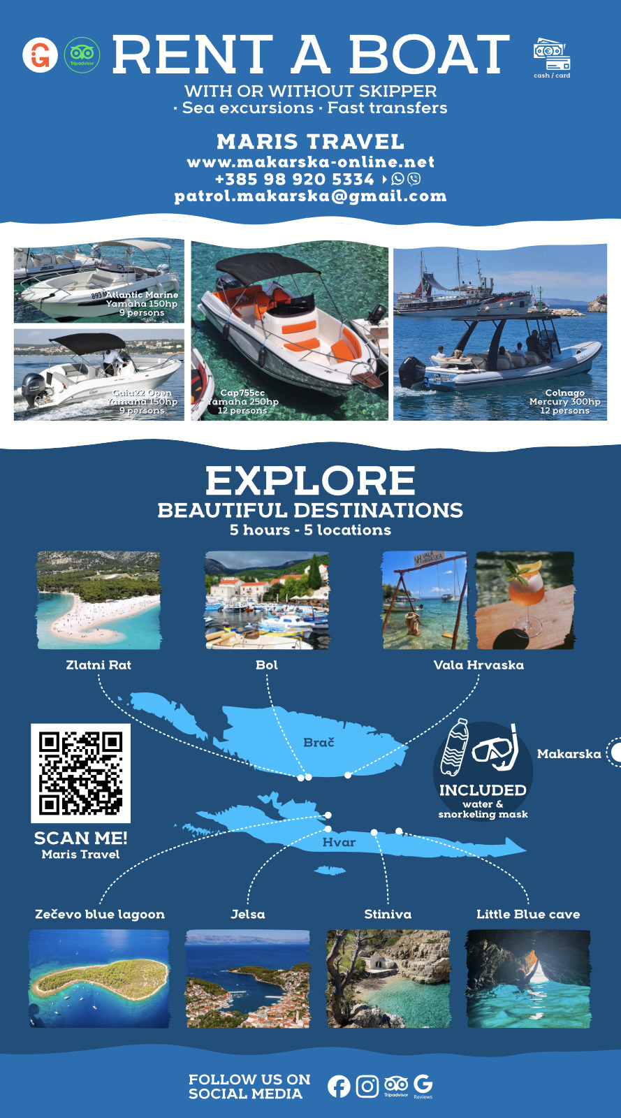 Thank you so much for one of the most amazing and beautiful days we had in our lives. Your knowledge and kindness and hospitality has left us speechless. We were a big group of seven people who spoke Croatian, English and Swedish. Age range 16-46. Every one of us was as impressed with a beauty of Croatian coast but the islands are the gem of Croatia. We rented the boat for a whole day and it was perfect. Perfect size for us with a perfect host/skipper Mario. He took us to few secluded beaches where your breath is just taken away by the colors that surround you, the smell that takes you to some happy place you didn't even know existed and you jump in for a swim and it feels like paradise. Zlatni Rat (Golden Horn) Bol, Brač was beautiful. We followed Mario's sugestiones and did three stops on Brač and two on Hvar. Pakomina beach and a restaurant where we had a lunch is a must. Every stop had something new and beautiful. We would recommend Maris Travel Rent A Boat Makarska to everyone. It is truly amazing experience and for us was the best day of our 10 day vacation. It's one of those days you never want to end. See you soon again Mario and a big thank you from all of us.